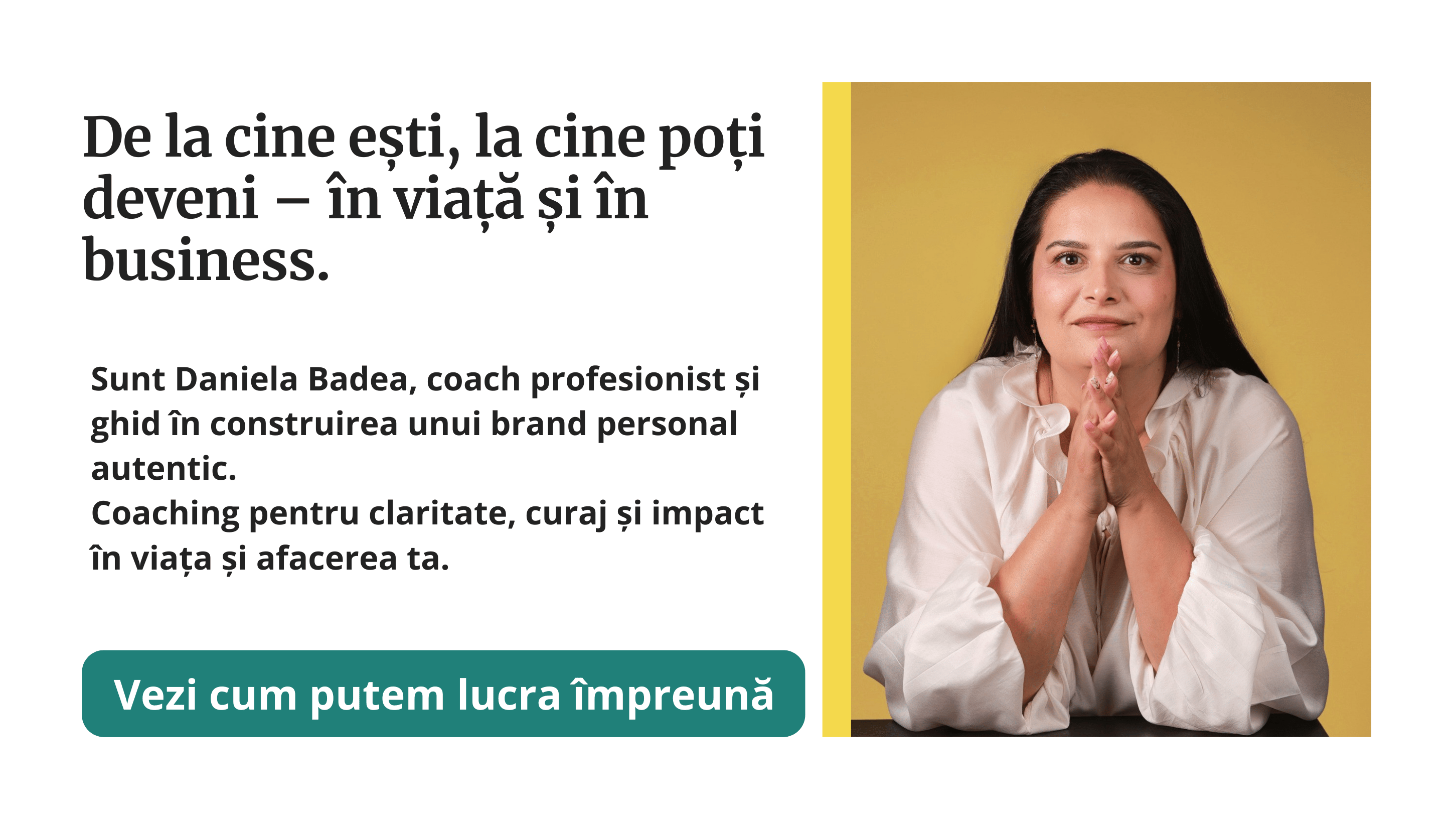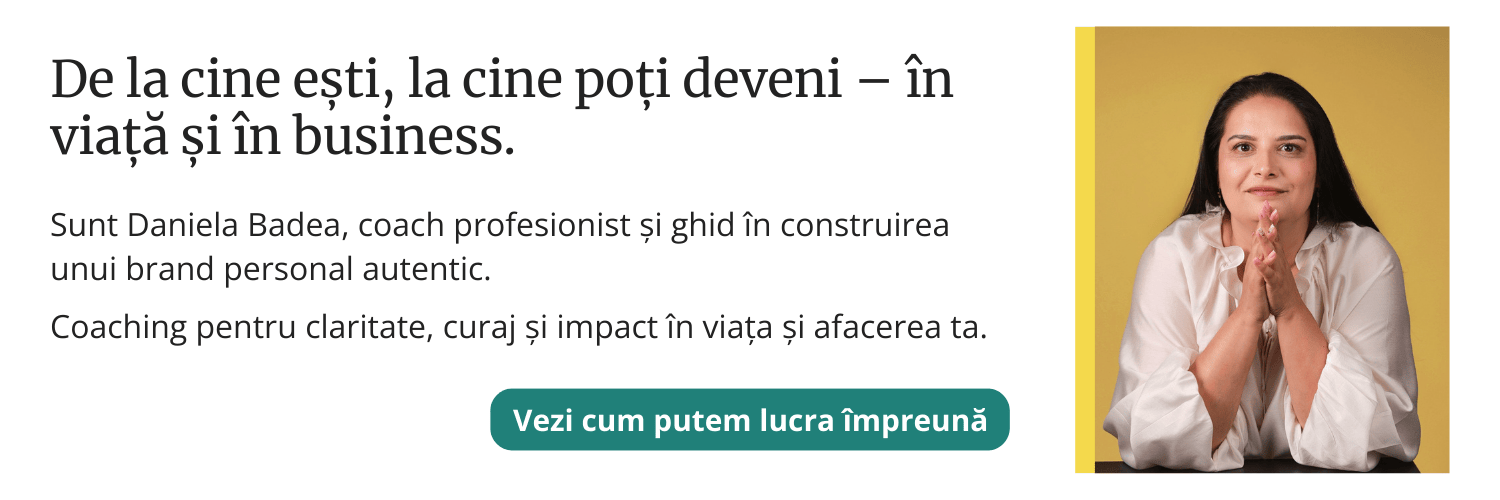 Sunt Daniela Badea, coach profesionist și ghid pentru antreprenori, freelanceri și lideri care își doresc mai multă claritate, curaj și autenticitate.